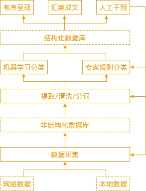 頂層框架包括數據采集、自動清洗、智能(néng)分類、情報呈現、彙編報告、人工幹預等6個部分。