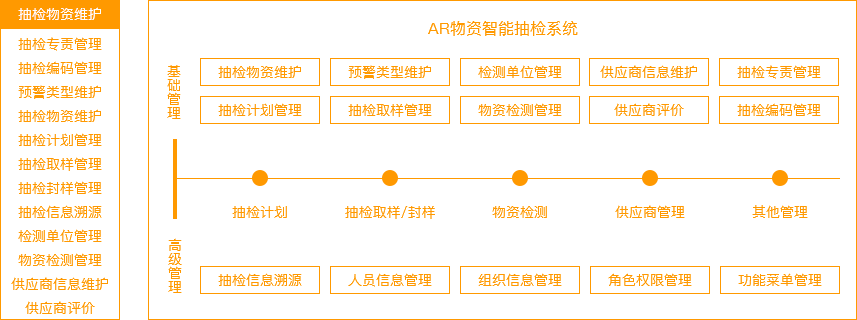 抽檢計劃維護(PC端)、抽檢任務執行(PC端)、抽檢計劃查詢(APP端)、抽檢任務查詢(APP端)、抽檢明細管理(APP端)、抽檢狀态查詢(PC端)、視頻回收站(PC端)。